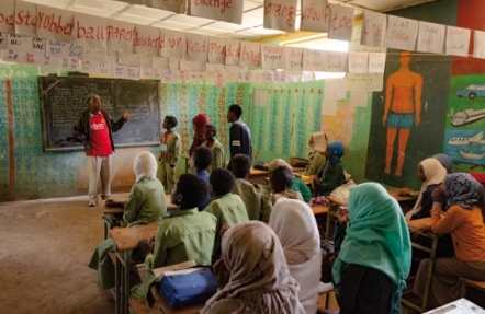 Forme, colori, numeri e lettere di un alfabeto antico, l’amarico. Disegni, quaderni, fogli. E poi ancora volti, mani, teste colorate. Gli studenti condividono il banco in tre, tengono lo sguardo fisso sulla lavagna.