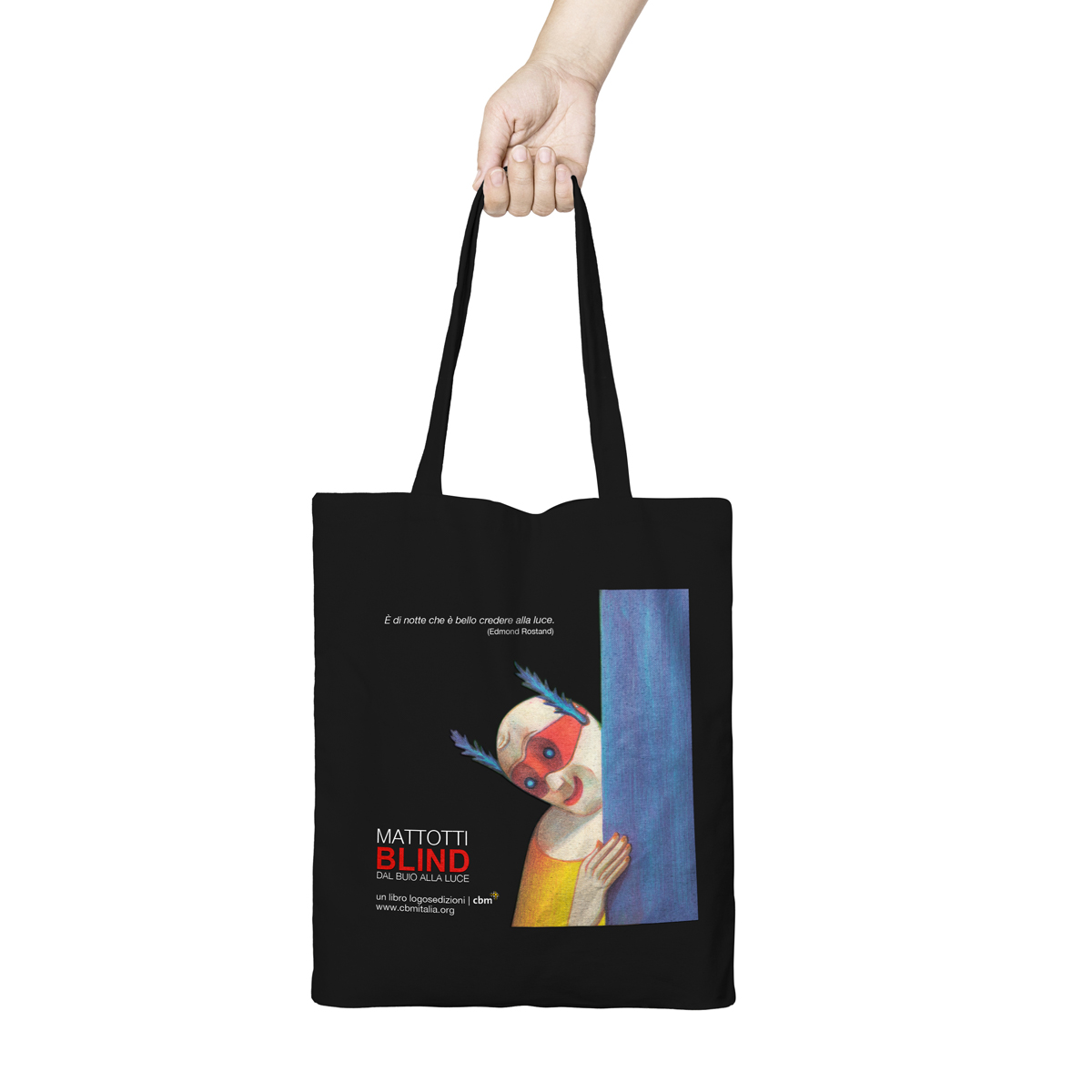 Borsa in tela nera. Illustrazione di Lorenzo Mattotti, citazione di Edmond Rostand: “È di notte che è bello credere alla luce”.